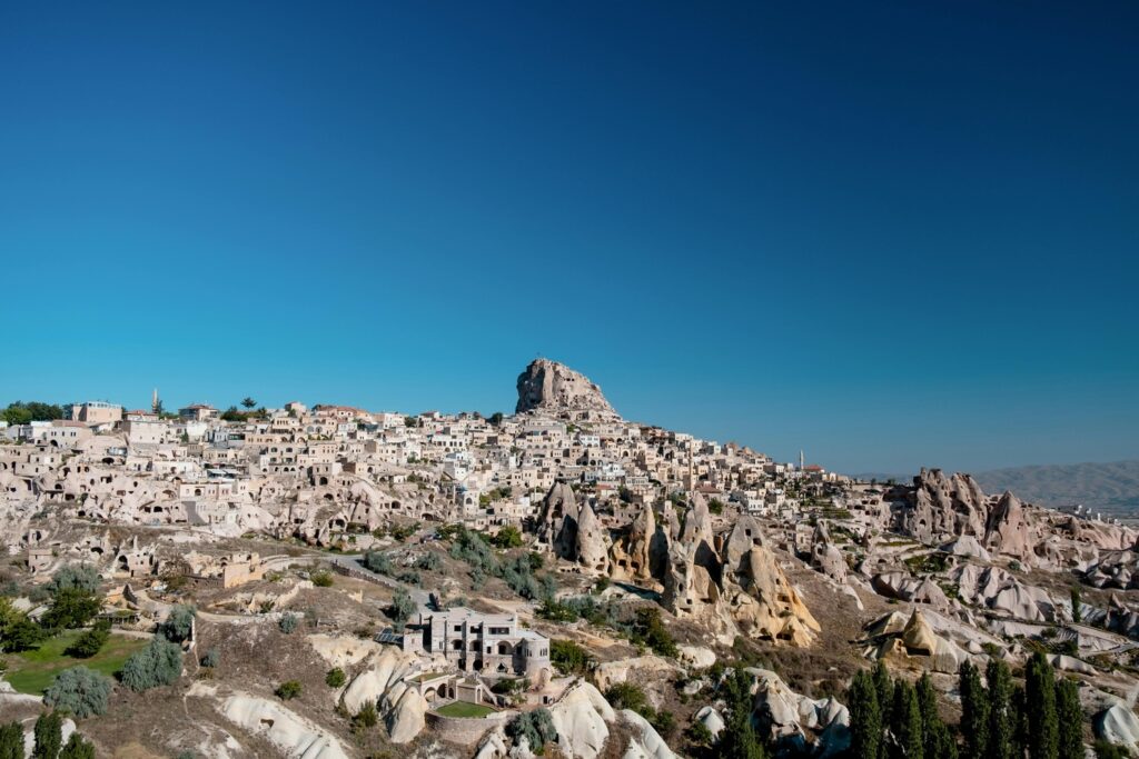 Desayuno bufé. Salida hacia Capadocia. Visita de la ciudad subterránea de Kaymaklı o Derinkuyu. Estas ciudades cristianas que datan de los siglos VIII y IX podían acoger a miles de fieles. Sus instalaciones tienen hasta 8 pisos bajo tierra, donde se pueden admirar los dormitorios comunes, cocinas, comedores, capillas, almacenes, etc. Visita de los parajes insólitos de esta región que nos sorprenderá con su paisaje lunar. Almuerzo. Por la tarde visita panorámica de la región: pueblo troglodita de Uchisar y del Valle de las Palomas y de la chimenea de las hadas. Continuación al hotel, cena y alojamiento.